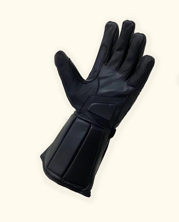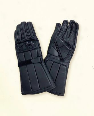 Пластиковые вставки на костяшках пальцев, крага удлиннная. Усиленная "пятка" на запястье.