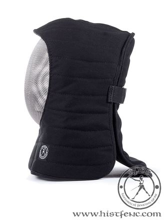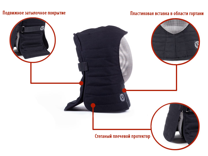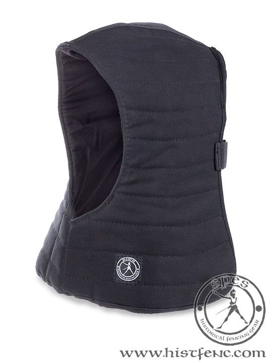 Это единственная накладка на маску, которая одновременно защищает гортань, плечи и затылок. Соответствует всем стандартным моделям масок для фехтования. Важным элементом этого намасника является пластиковая вставка в области гортани. Кроме того, накладка имеет стеганый плечевой протектор и подвижное затылочное покрытие, которое усилено пластиковыми пластинами. Наиболее важным аспектом этого наложения является эффективная защита шеи.